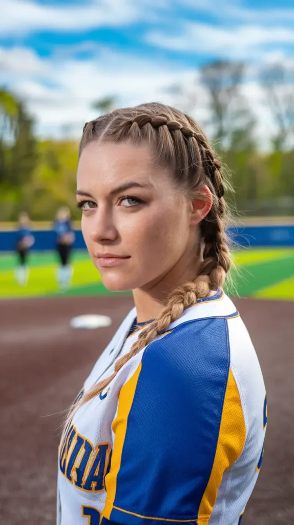 The side braid with beads is a fun and stylish hairstyle perfect for the softball field. This look is not just practical; it adds a touch of flair to any uniform.